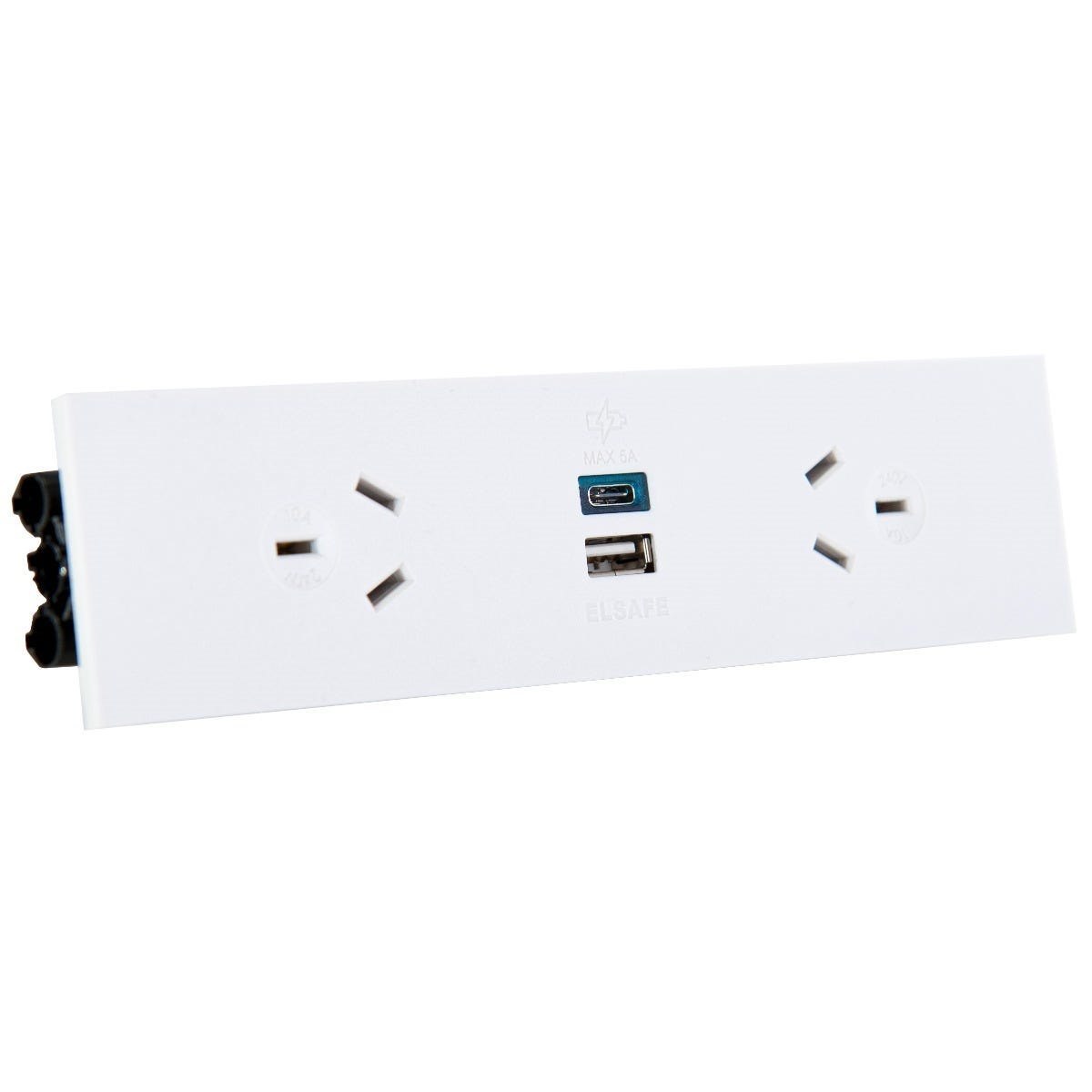 #html-body [data-pb-style=LMJMHS8]{justify-content:flex-start;display:flex;flex-direction:column;background-position:left top;background-size:cover;background-repeat:no-repeat;background-attachment:scroll}OE Elsafe: QIKFIT Twin USB Fast Charger TUF - WhiteThe OE Elsafe QIKFIT 'Twin USB Fast charger TUF ' has been developed to provide a compact power source for charging portable devices without the need for plug-in chargers. Simply plug the device's USB charging lead into either the Type-C or Type-A USB port for class-leading charging performance. The QIKFIT Twin USB Fast charger is designed to be used in the OE Elsafe floor, desk, and ceiling boxes. Developed for full cross-product capability the OE Elsafe QIKFIT Twin USB Fast charger (QIKFIT TUF charger) automatically communicates with the portable device connected so that it can then draw the optimum charging power. Able to fast charge one or two devices simultaneously at up to 6 x faster than a standard PC or laptop USB outlet, and comparable to OEM chargers, the QIKFIT TUF charger satisfies the demands of the most power-hungry devices. **Housing NOT included***FEATURES Charge one or two devices simultaneously at up to 6 x faster than a standard PC or laptop USB outlet Independently tested to the latest Australian safety standards Protects against both input and output current overload and short circuits Automatically communicates with the portable device connected Sleek modern design All sockets are auto switched The soft-wired QIKFIT do not use regular IEC Connectors as they come with GST male and female connectors allowing for multiple QIKFITS to be daisy-chained. You will need to use this with an OE-Elsafe starter and/or interconnecting cable Designed to easily clip onto an OE Elsafe Prodigy Basket and QIKFIT-compatible boxes and modules SPECIFICATIONS Material: Polycarbonate Body Colour: White Dimensions: 185.5mm x 41.5mm x 24mm USB Charging Outlets: 1 x Type-C & 1 x Type-A Charging current: Max 5A in total AC voltage range: 200-240VAC at 50/60Hz AC input current: Max 0.6A at full load, less than 0.5mA at no load Rated total output: 25W Output voltage: 5V DC +- 5% Standby power use: Less than 0.1W Life expectancy: Min. 5 years in normal use USB Connectors: Gold Plated for Improved Contact Type-A specifically manufactured for a minimum of 5000 insertions. Type-C for a minimum of 10,000 insertions Over current protection: Self Limiting Short circuit protection: Self Resetting Compatibility: Apple iPad/iPhone, Android, Samsung, Blackberry Operating temperature range: 0° to 35°C Max relative humidity: 85% RH WARRANTY1-year limited warrantyWHY 4CABLING?
